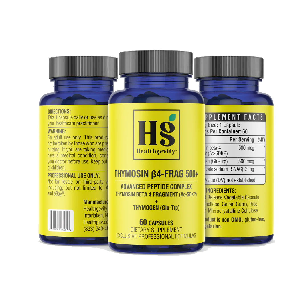 Thymosin Beta-4-Frag 500+ is a synergistic blend of Acetyl-N-Ser-Asp-Lsy-Pro (AcSDKP), and Thymogen (Glu-Trp). Research has confirmed its regenerative potential, immune modulation, supportive role for gut health, inflammaging and fibrosis.